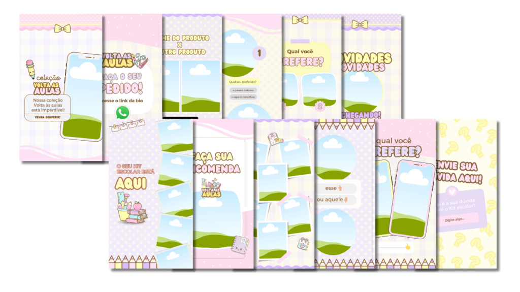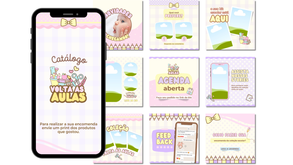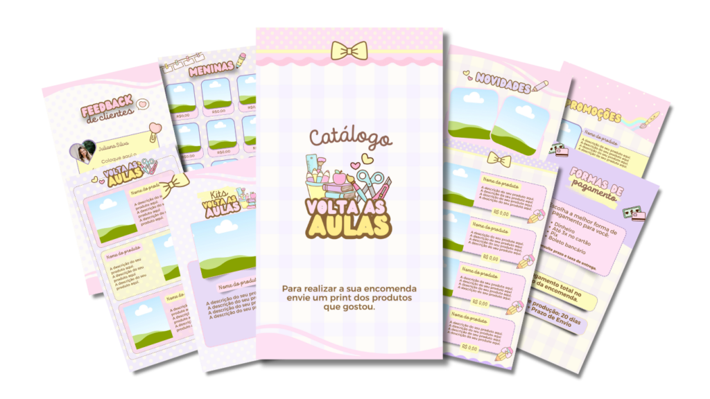 Com o catálogo editável Volta às aulas você mesma edita e personaliza como quiser, com as cores da sua paleta, imagens e descrições dos seus produtos, duplica as páginas de acordo com a quantidade de produtos que tem podendo chegar até 200 páginas no total. Demais, né?